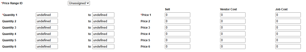 - If you are going to be selling these items with price breaks, the grid here is how you would designate them. For no price breaks, only use the first row and set the range to “1+” to “undefined”.