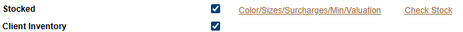 Next to the Stocked checkbox, you will now see a link to add the colors and sizes as well as another checkbox for if the inventory is owned by the client. Please pay close attention to this as it will determine whether Triple Stitch owns the stock or the client.