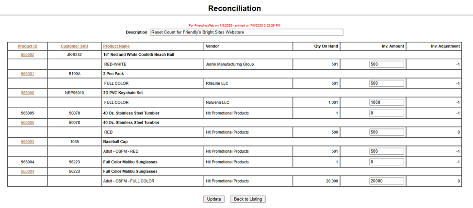 You will need to put in the Inventory amount for each item as well as a description of the report. Once you have put in the counts click on the update button below.