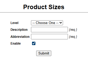 You will need to select the new Product Class that was created and hit the add button. For each size, add the level, description, and abbreviation for each size. Please note that the description and abbreviation can be the same.